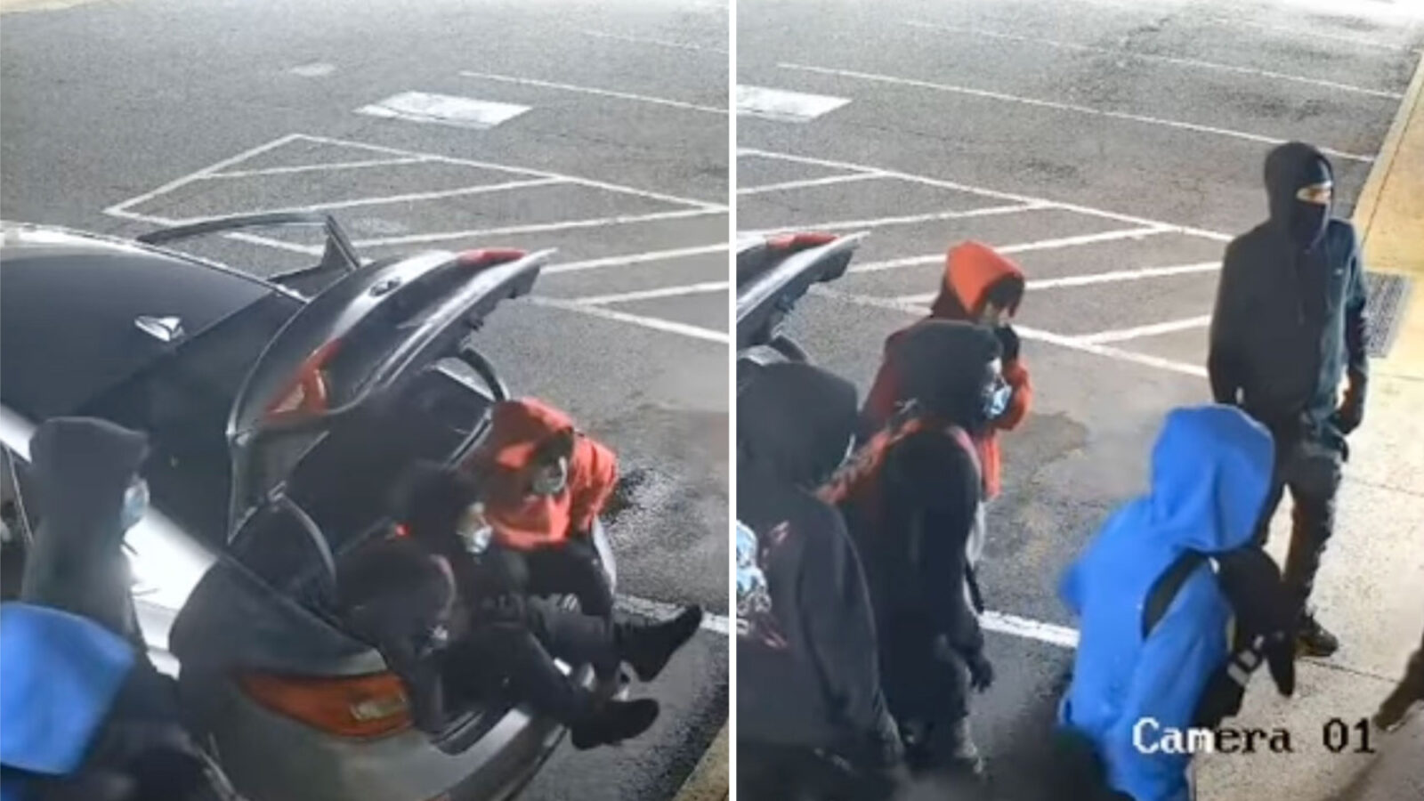 Nine masked thieves were caught in absurd footage piling out of a single sedan — with two even clumsily emerging from the trunk — before robbing a building in Virginia, according to cops.