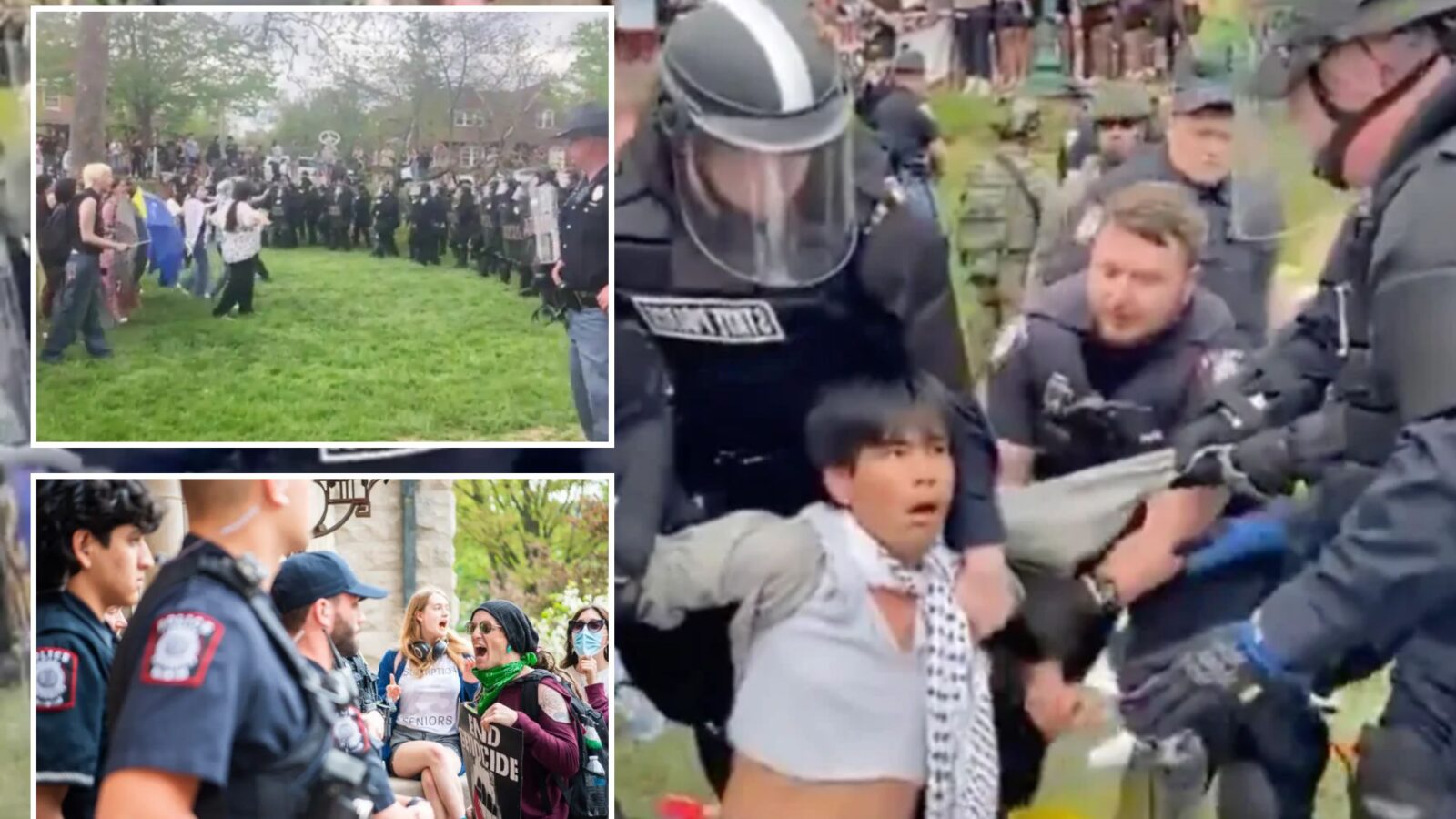 Video shows the protesters linking arms as riot police pushed forward with shields. One clip shows at least four officers dragging off a single protester by the back of their shirt before officers dismantled the student encampment.