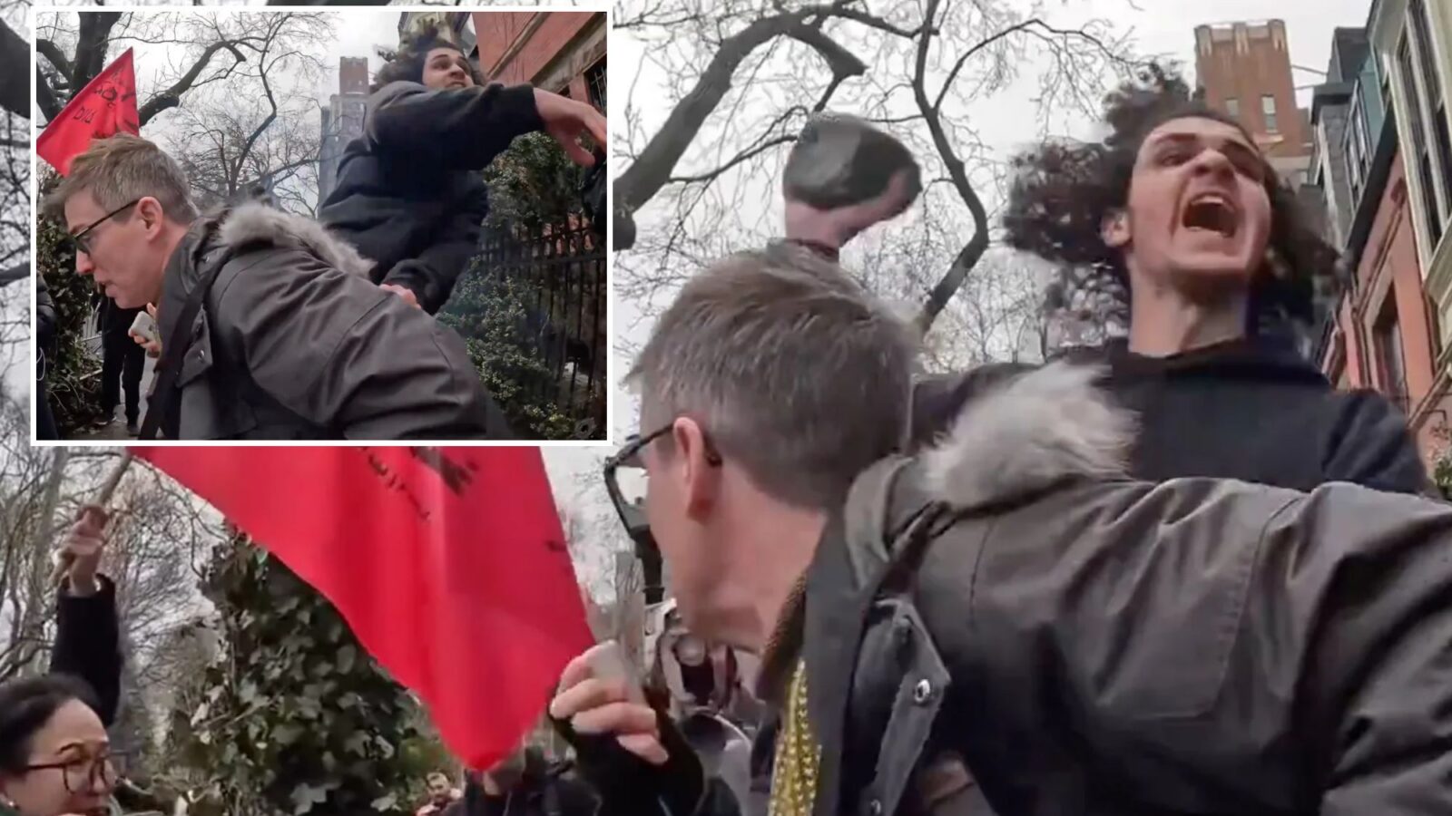 The short clip shows Emir Balat, 18, coming up behind a speaker addressing a small crowd outside the Upper East Side mansion Saturday before hurling something over his head and out of shot.