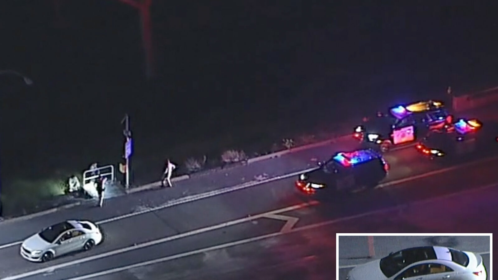The driver, who was being pursued by California Highway Police officers, crawled onto the roof of the allegedly stolen white Mercedes-Benz as it was rolling along the 605 and 91 freeway interchange in Cerritos before hopping off and making a run for it.