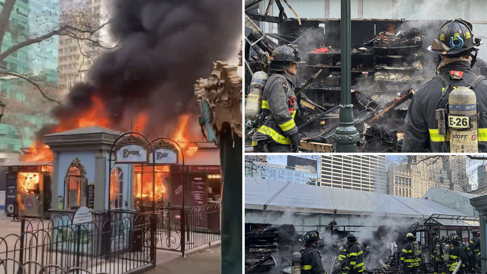 The fire broke out around 9:20 a.m., causing heavy plumes of fire to erupt from the shed set up inside the park on West 40th Street between Fifth and Sixth avenues, according to the FDNY and video from the scene.