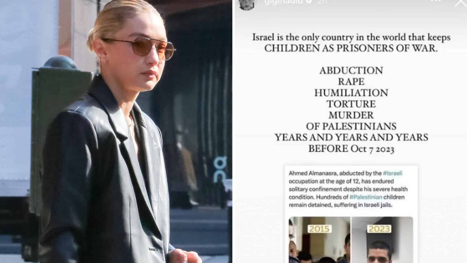 Hadid’s post to her 79.1 million followers also featured a photo of Palestinian terrorist Ahmed Mansara, who she claimed was “abducted” by Israeli authorities at the age of 12 and “has endured solitary confinement despite his severe health condition.”