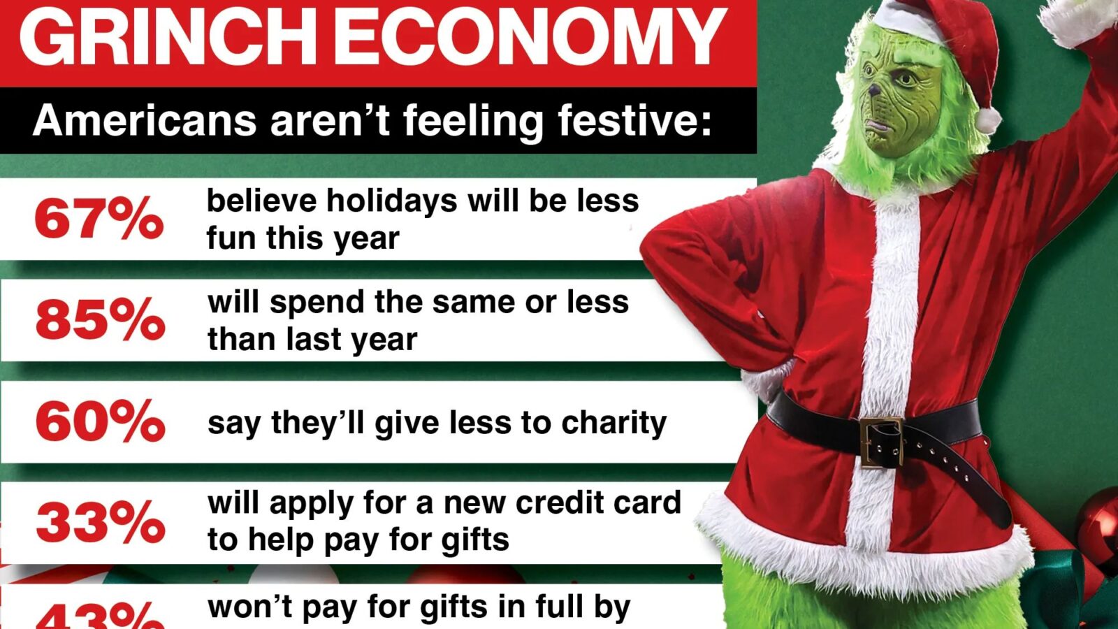 Nearly two in three Americans say the economy will make the holidays less fun this year, according to a new report from WalletHub called “The Grinch Economy.”