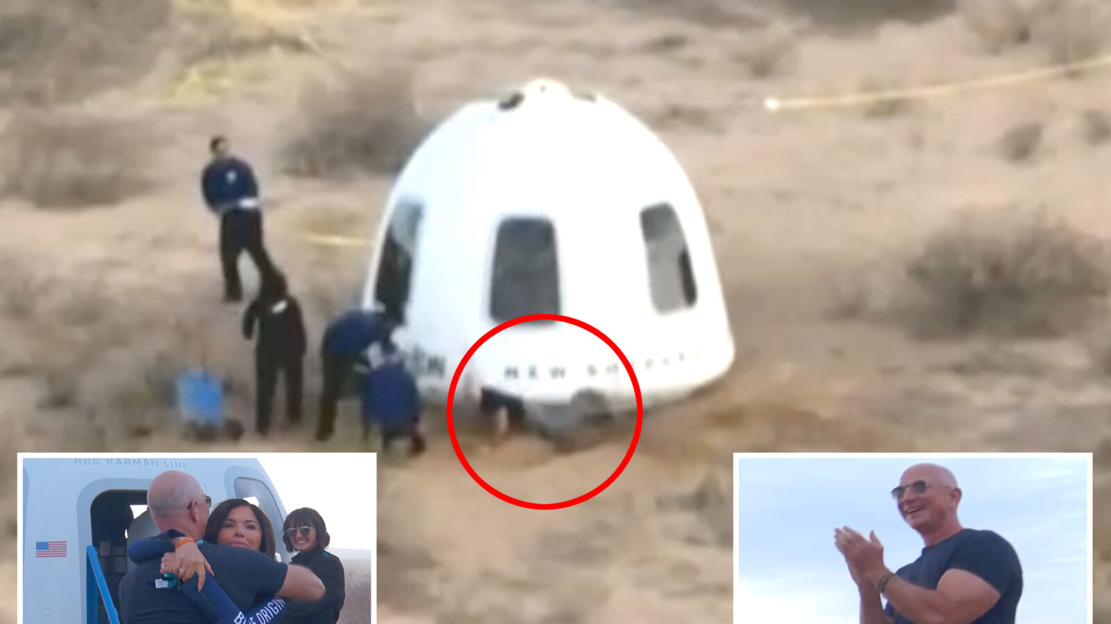 The livestream of the historic launch caught the moment Bezos, 61, fell face first to the ground as he went around the windows of the capsule carrying his fiancée.