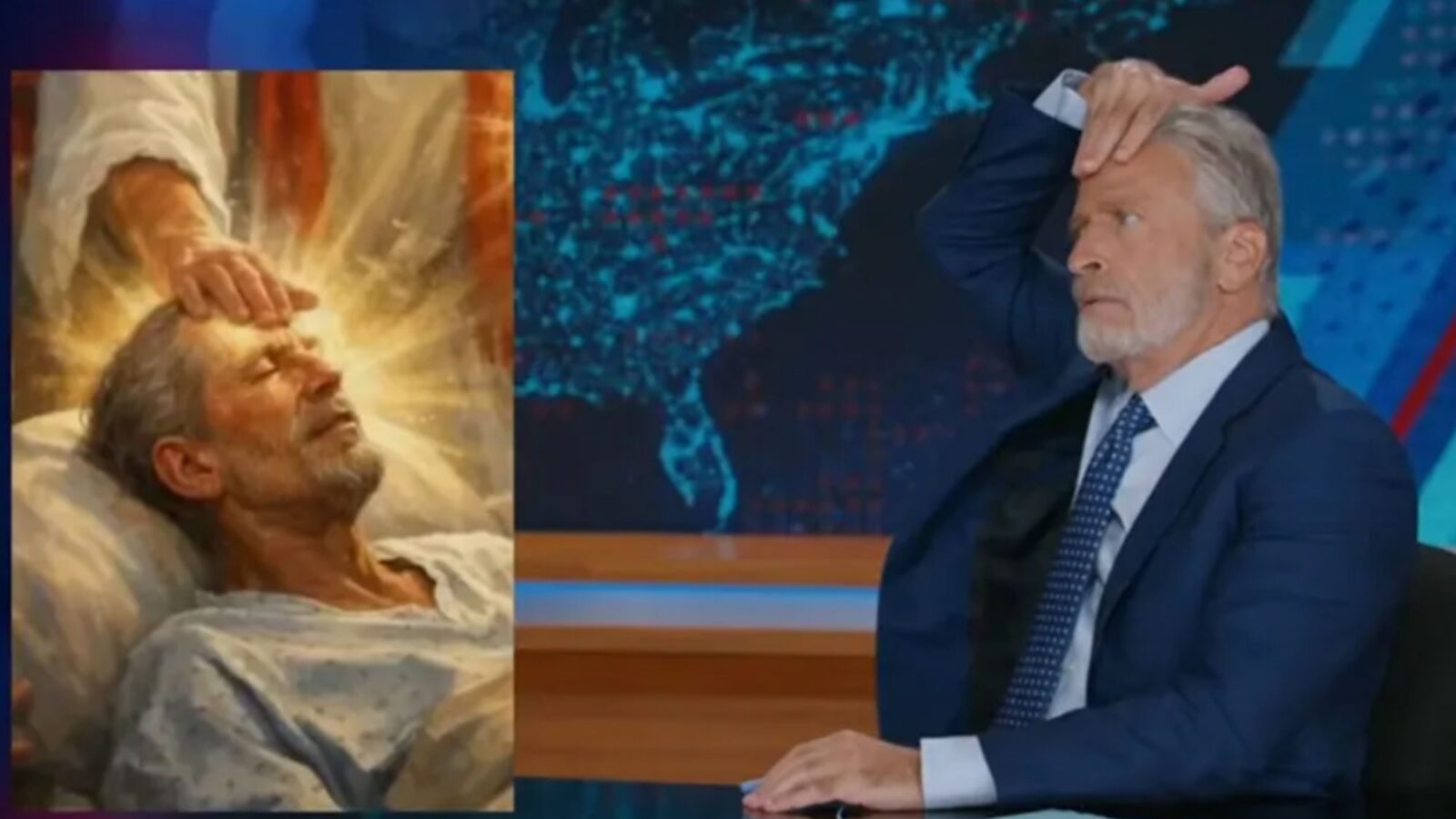 Trump posted an AI image of himself as Jesus healing a bedridden–wait, is that Jon Stewart?! pic.twitter.com/P4Fgs7v8YY