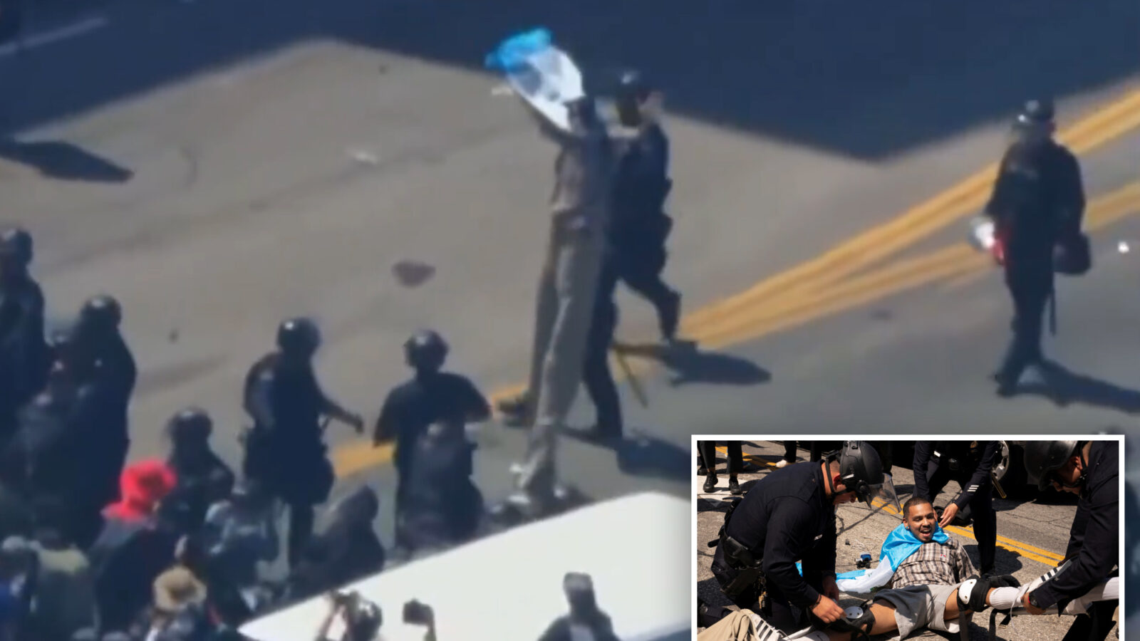 A protester walking around on stilts was knocked down by cops after they struck his wooden legs while they tried to quell unrest at an anti-ICE riot in Los Angeles over the weekend.