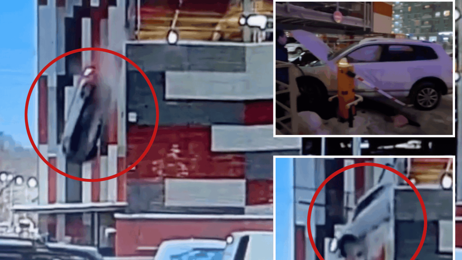 Surveillance footage captured the moment Evgeny Shamko, 40, drove straight through a flimsy rail barrier on the fourth floor of a Moscow parking center, slamming through it with ease and sending the car plummeting to the ground.