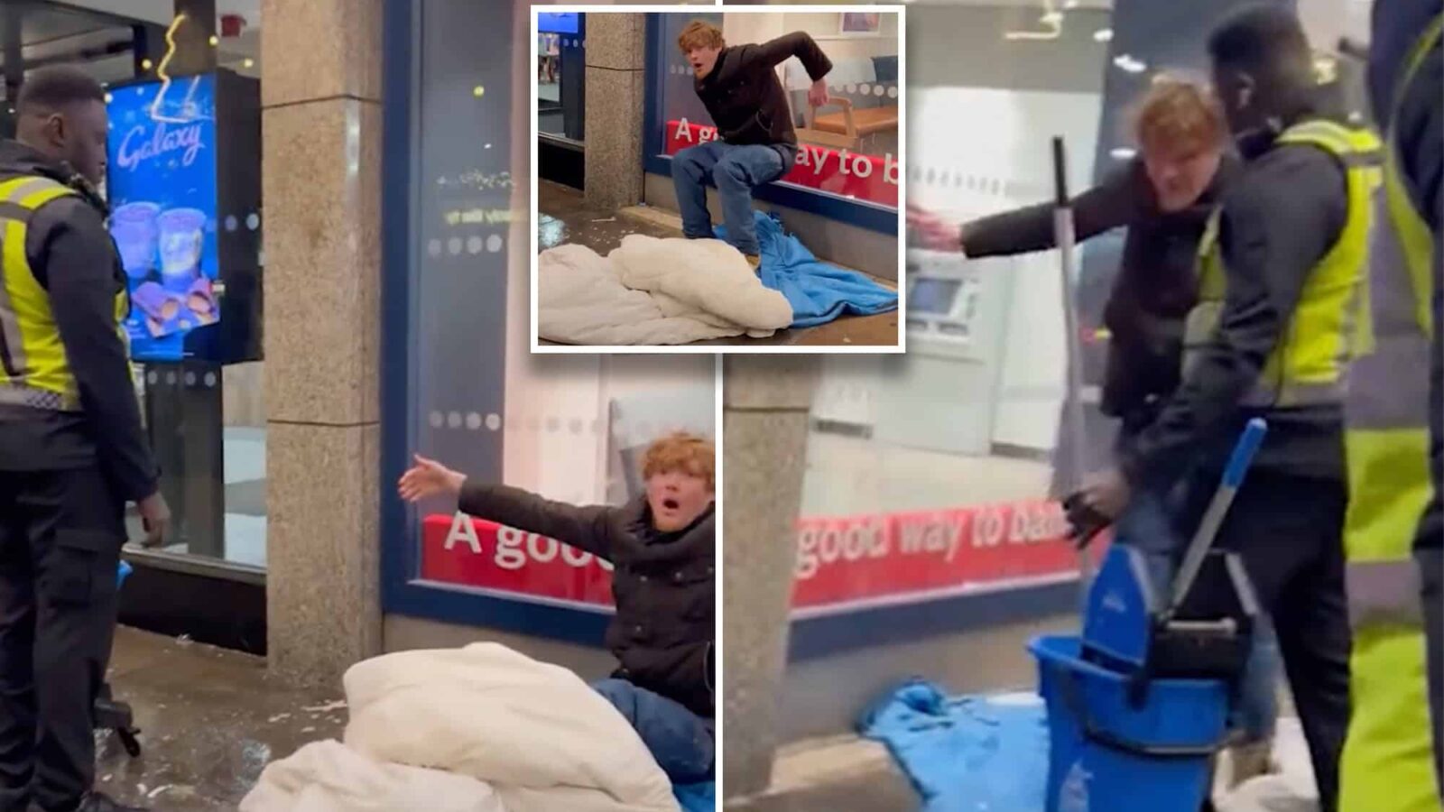 A British McDonald’s security guard has gone viral after he was filmed aggressively mopping the ground where a homeless man was camped — leaving his blankets soaked in water and bleach.