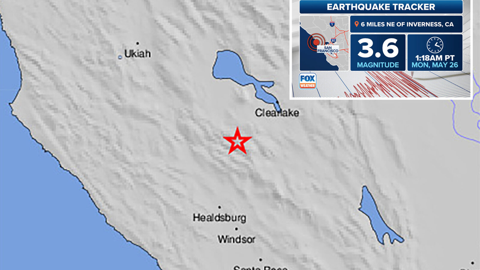 According to the U.S. Geological Survey (USGS), the magnitude 3.6 earthquake was reported about 6 miles northeast of Inverness, California, around 1:18 a.m. local time, at a depth of about 2.5 miles.