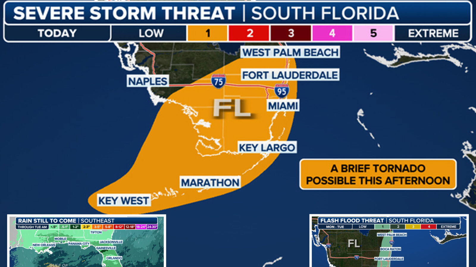 Outside the potential for flash flooding, severe storms are possible late in the day. A brief tornado and waterspouts are possible. Miami, Fort Lauderdale and Key West are all under threat.