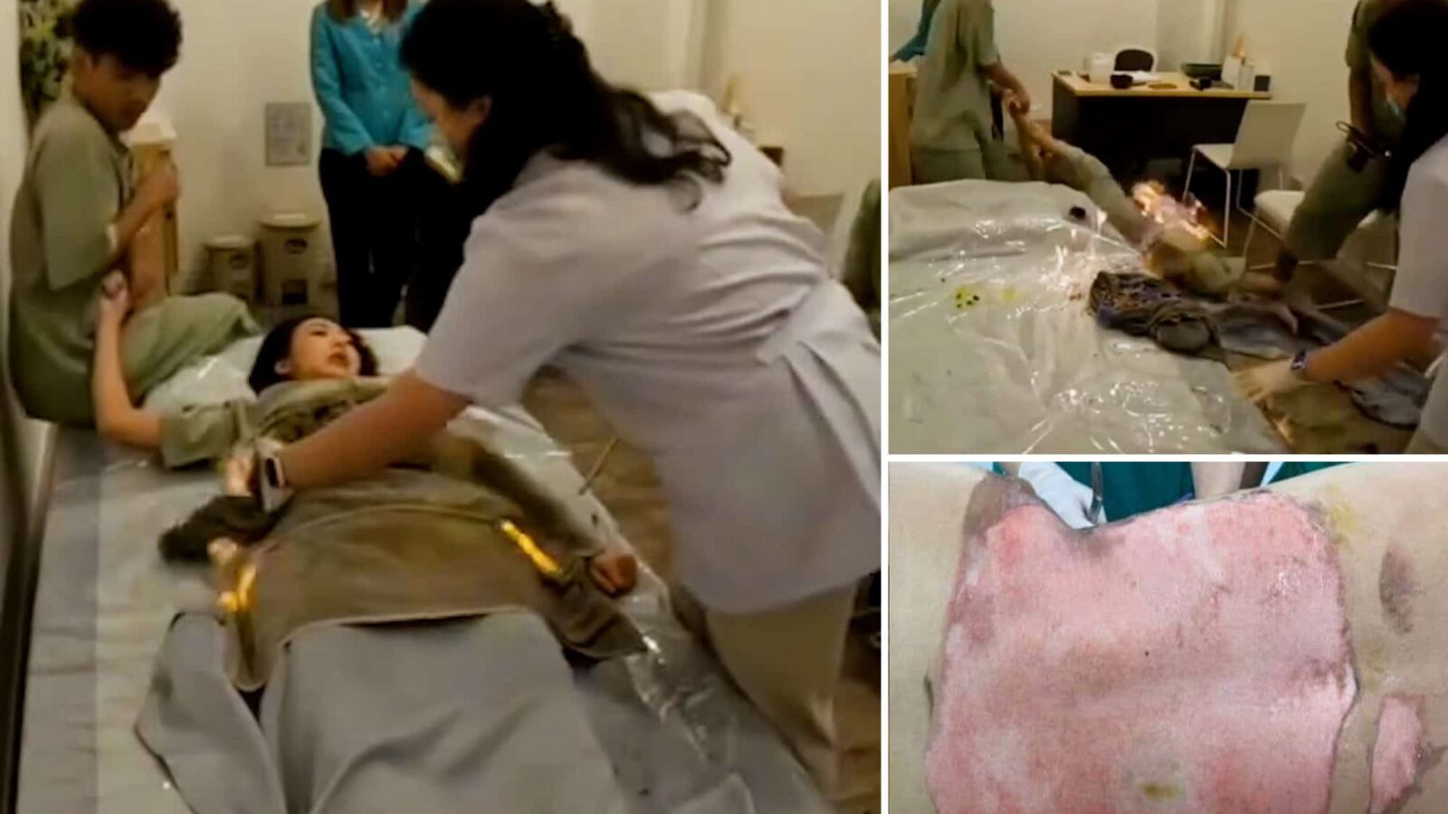Horrifying video captured the moment a model was suddenly engulfed in flames while receiving an alternative medicine treatment in Thailand — and was left suffering from painful third-degree burns and blisters for months.