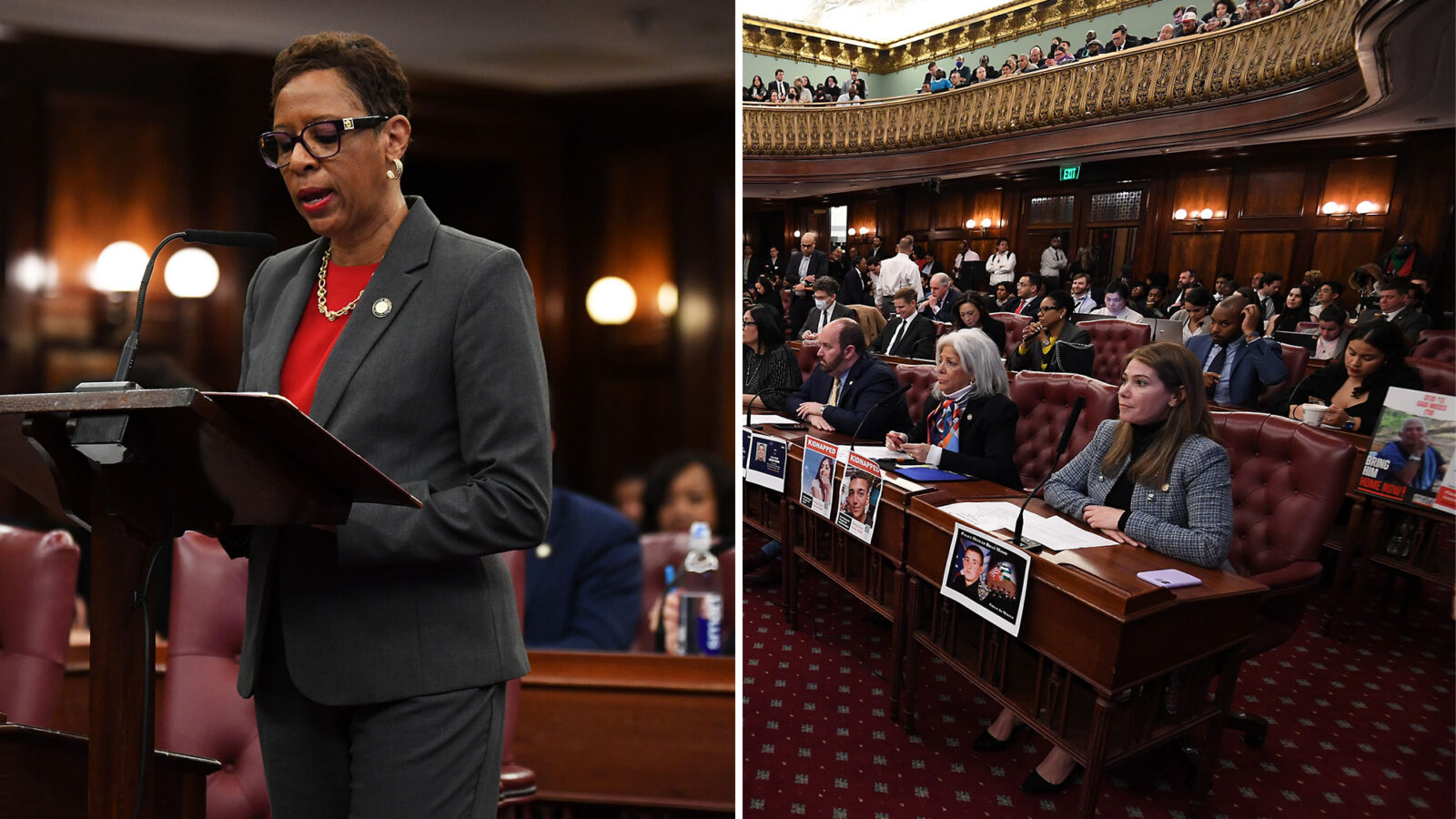 Some council members, including Bob Holden, Vickie Paladino and Kalman Yeger — who had been covering his desk with no less than four kidnapped signs for months since Hamas’ Oct. 7 attack — opted to wear pins in support of the Israeli hostages on their clothing instead.
