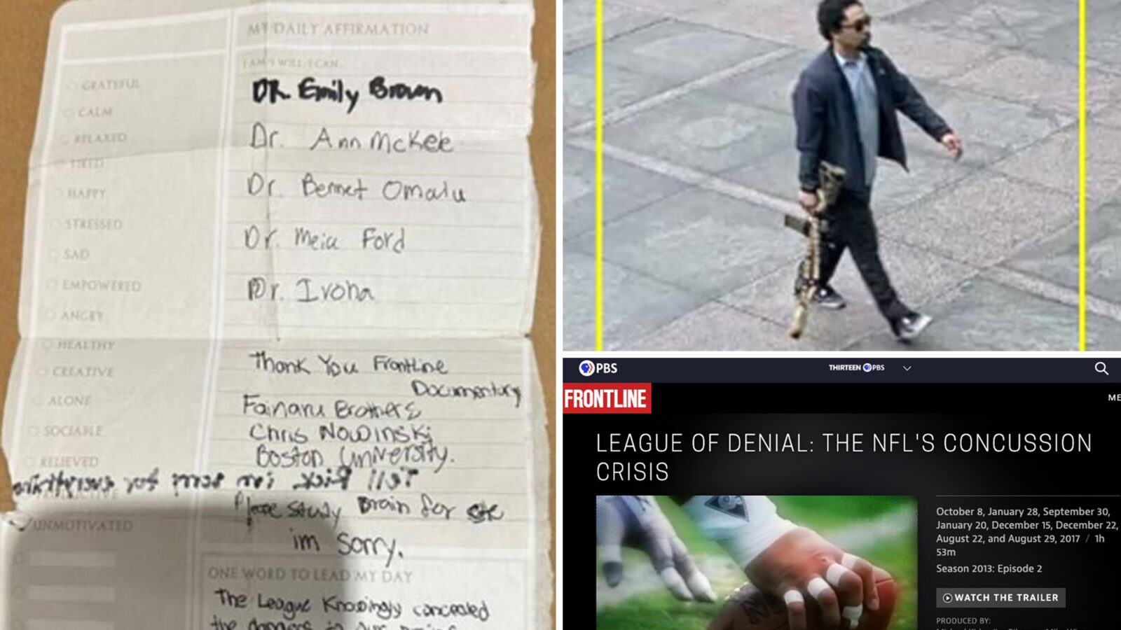 Tamura, who claimed he suffered from CTE, had scrawled “frontline documentary” on one of the pages — an apparent reference to the “League of Denial” doc that probed the links between the NFL and the brain injury linked to head trauma.