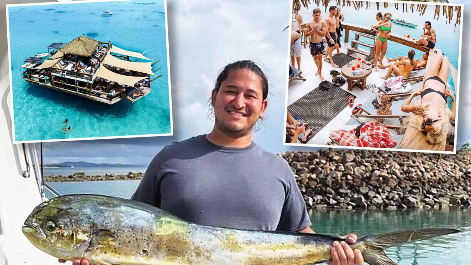 Another picture shows Castro and his friends in swim shorts posing on the exclusive Cloud 9 bar, billed as ‘Fiji’s floating paradise”.