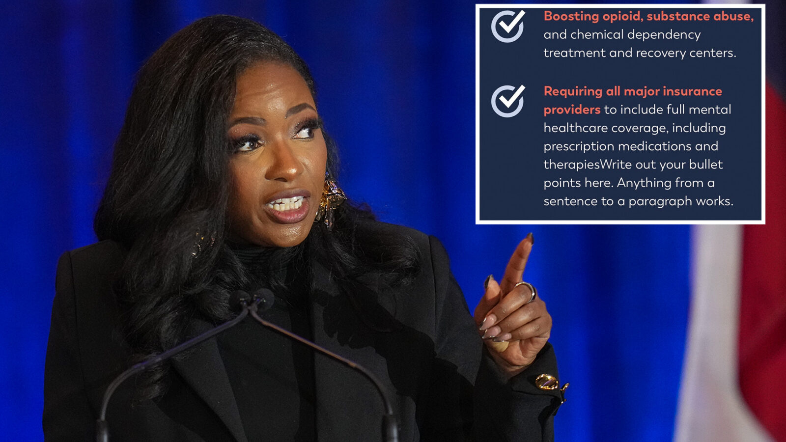“Requiring all major insurance providers to include full mental healthcare coverage, including prescription medications and therapiesWrite out your bullet points here. Anything from a sentence to a paragraph works,” the text read.