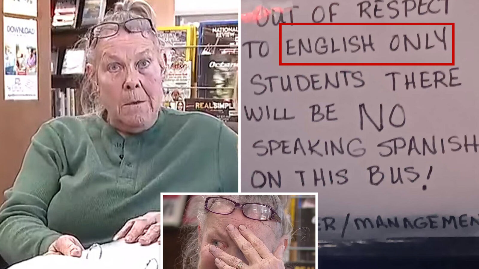 Diane Crawford, 66, lost her job of three decades after sparking outrage with the handwritten sign reading: “Out of respect to English only students there will be NO speaking Spanish on this bus.”