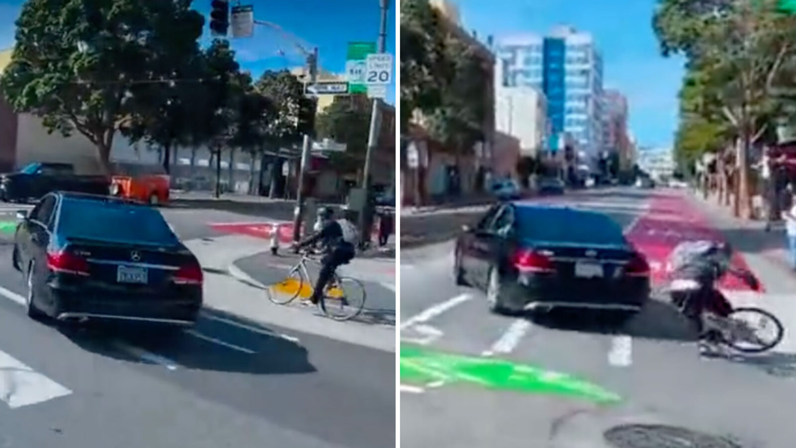 The clip, first reported by KRON4, shows a black Mercedes sedan pulling into traffic before abruptly turning into the path of a cyclist traveling in a designated bike lane.