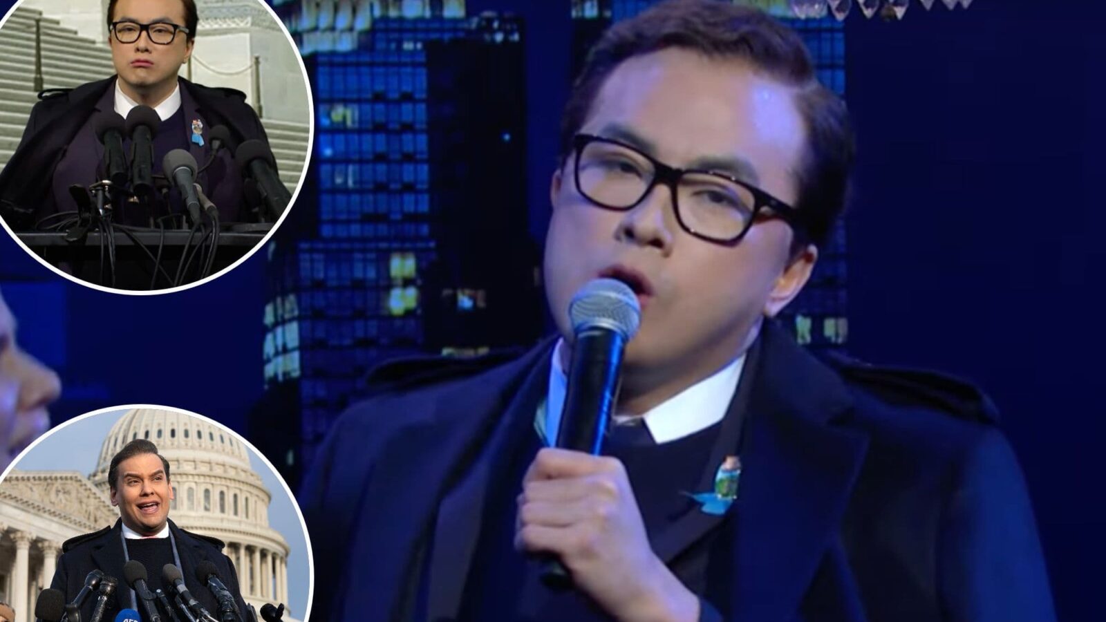 Holding a press conference outside of the Capitol building following his expulsion, Santos, played by Yang, insisted he was being assaulted and bullied by the entire country because he was a “proud, gay thief.”