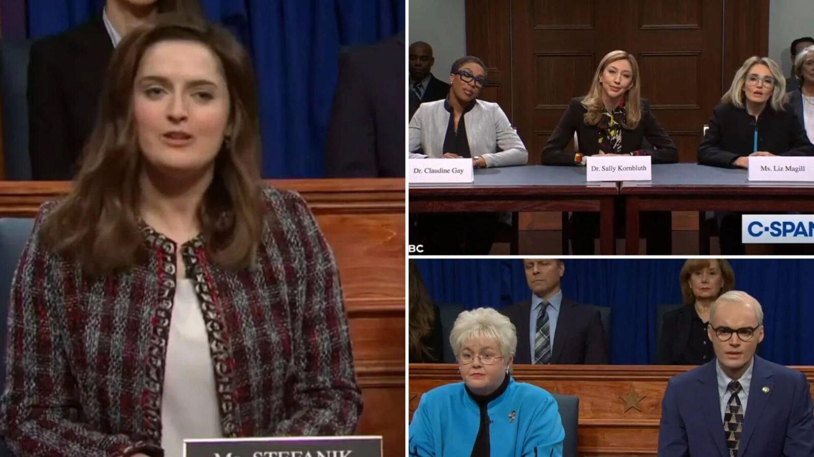The opening sketch, set up as a C-SPAN broadcast, tried to poke fun at the presidents of Harvard, UPenn and MIT — portrayed by Ego Nwodim, Heidi Gardner and Chloe Fineman, respectively — as they testified before the House Education Committee.