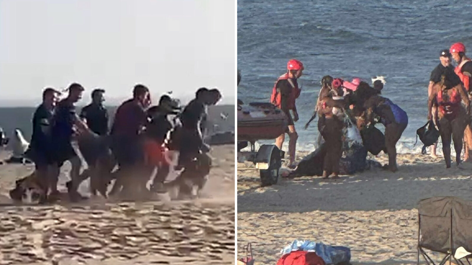 Dramatic footage posted to the Citizen app shows at least a dozen first responders sprinting across the sand carrying the victim to an ambulance as stunned sunbathers watch.