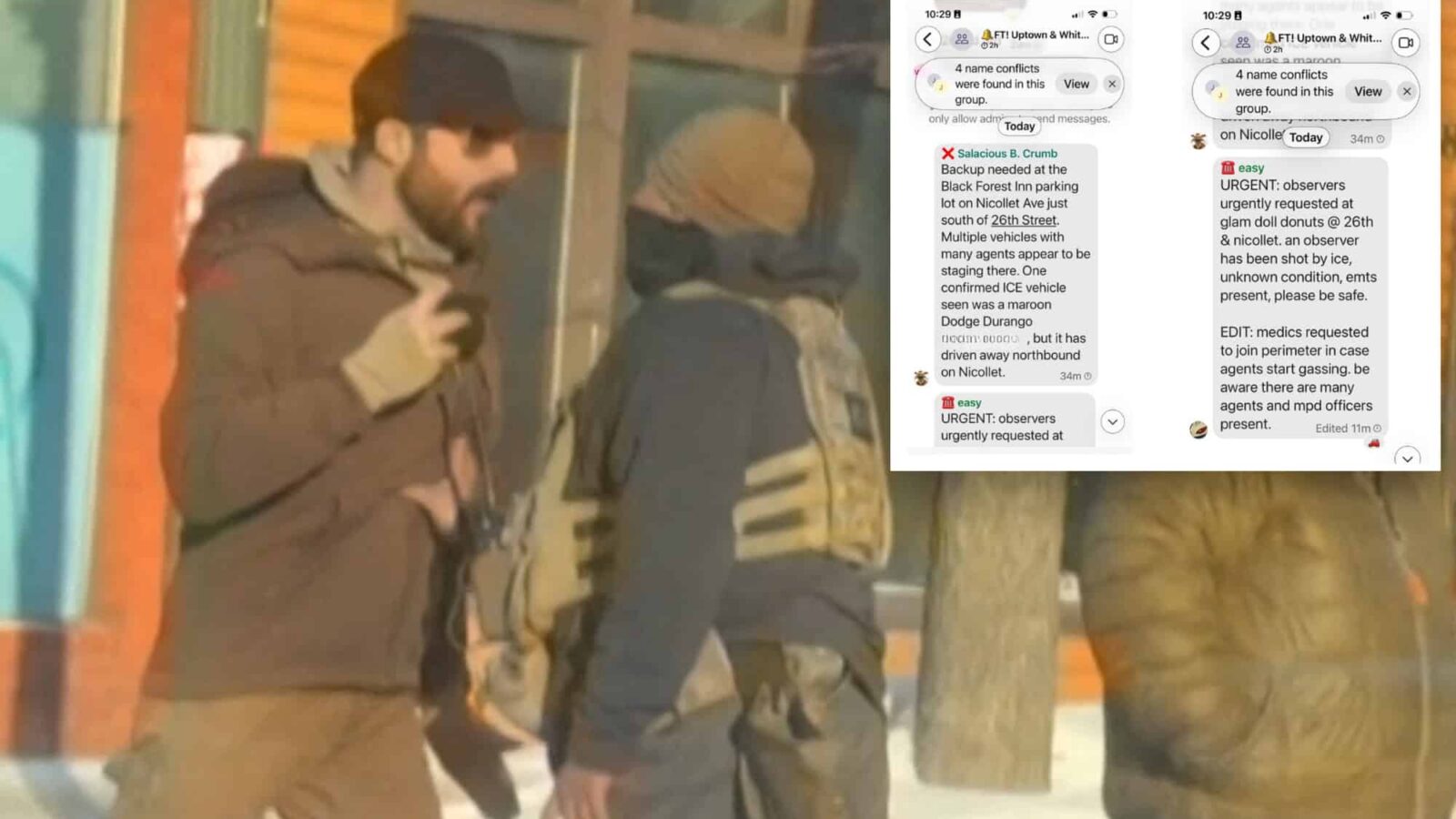 Using a red phone emoji to signal an all-points alert, a message blasted out: “☎️ easy. URGENT: observers urgently requested at glam doll donuts @ 26th & nicollet [sic],” the alert continued. “an observer has been shot by ice, unknown condition, emts [emergency medical technicians] present, please be safe. EDIT: medics requested to join perimeter in case agents start gassing. be aware there are many agents and mpd [Minneapolis Police Department] officers present.”