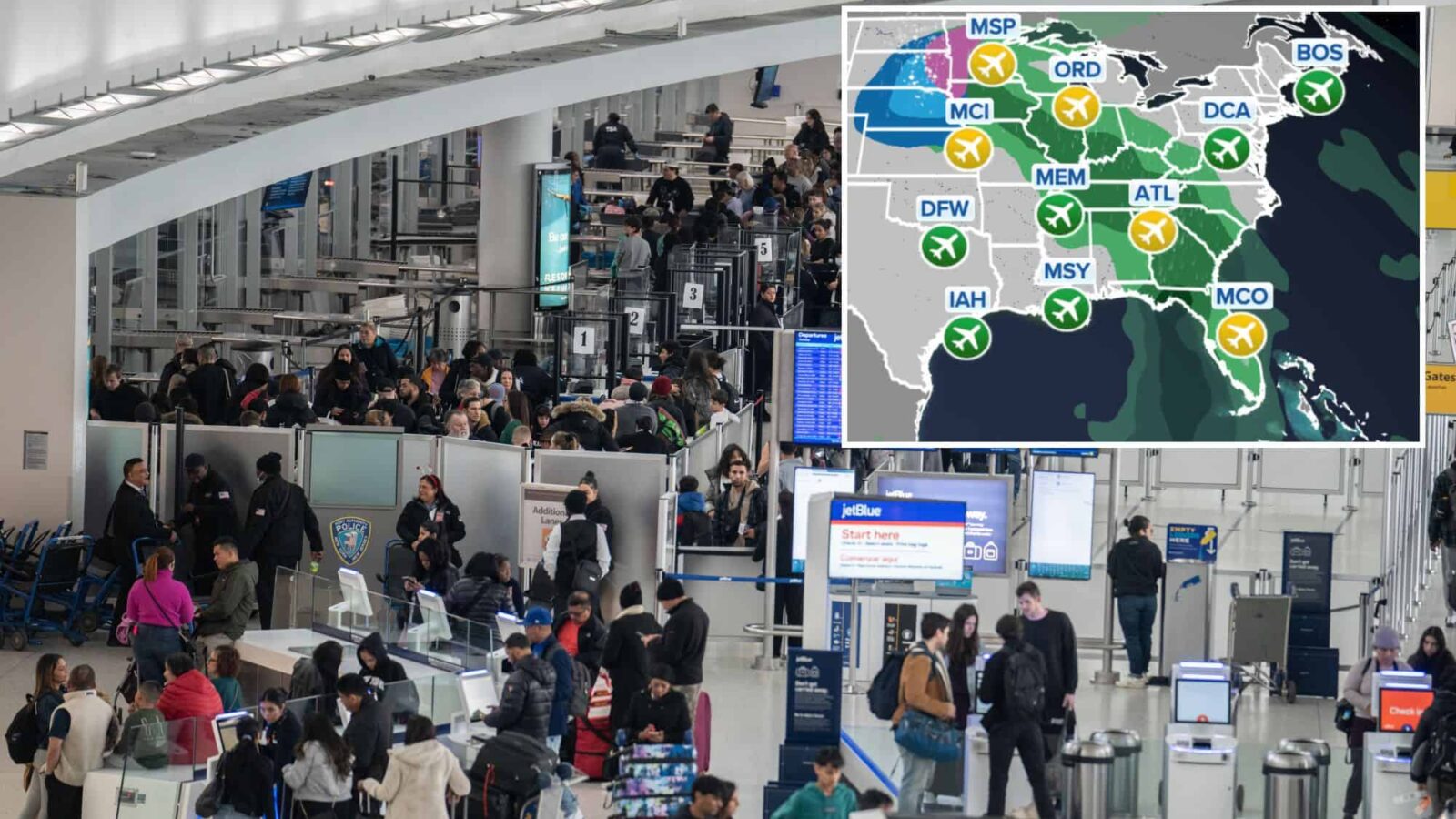 Meanwhile, rain spreading into the East may cause some minor issues in popular hubs like Washington (DCA/IAD).