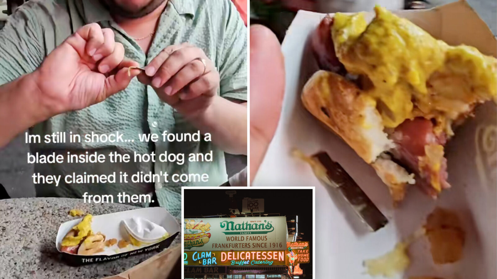 An Arizona family chowing down at the iconic Nathan’s Hot Dog stand in Coney Island claims they had a near-tragic visit when they found a razor blade hidden in the condiments.