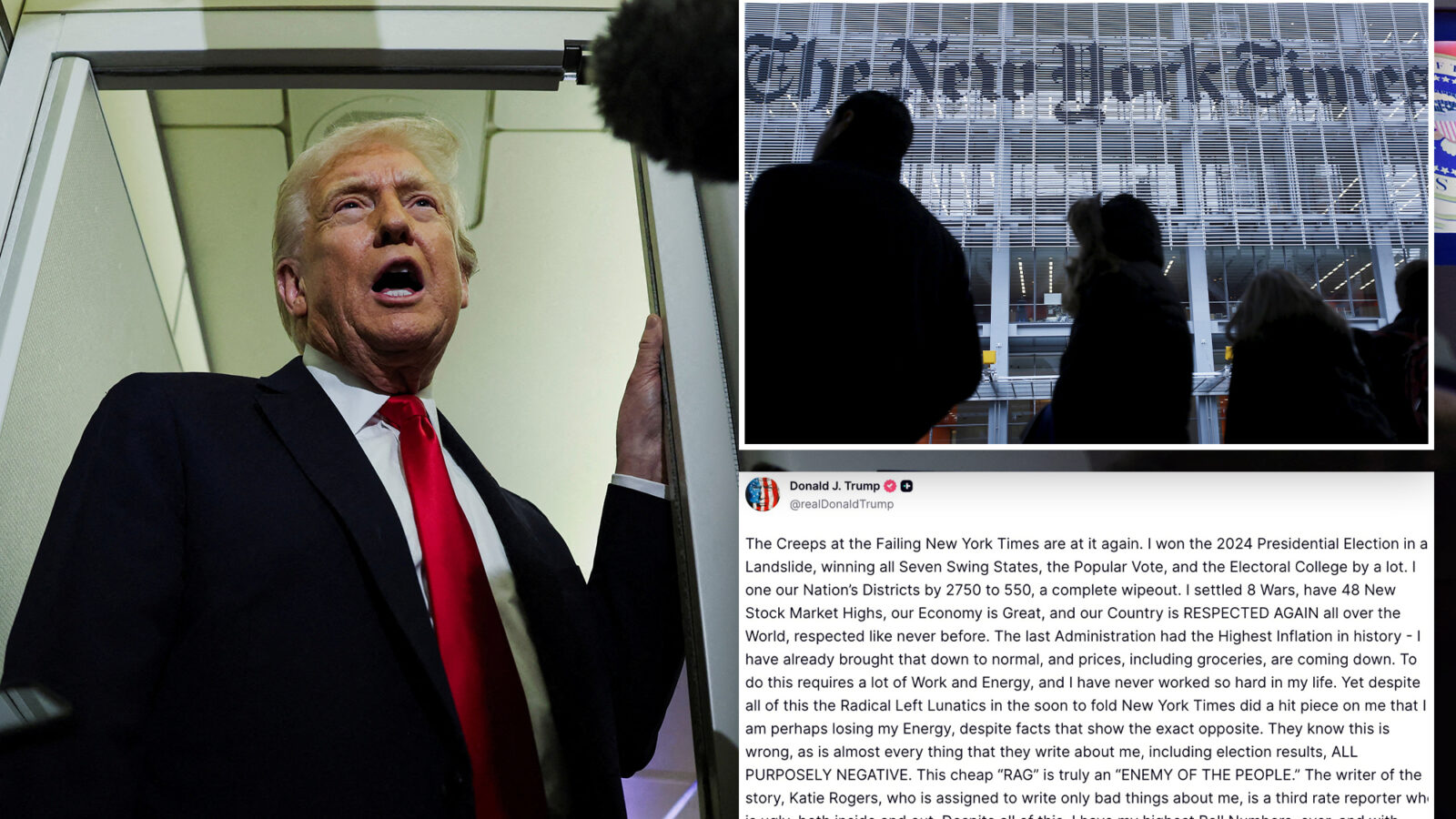 “[T]he Radical Left Lunatics in the soon to fold New York Times did a hit piece on me that I am perhaps losing my Energy, despite facts that show the exact opposite,” the 79-year-old raged over Tuesday’s story. “They know this is wrong, as is almost every thing that they write about me, including election results, ALL PURPOSELY NEGATIVE. This cheap ‘RAG’ is truly an ‘ENEMY OF THE PEOPLE.’”
