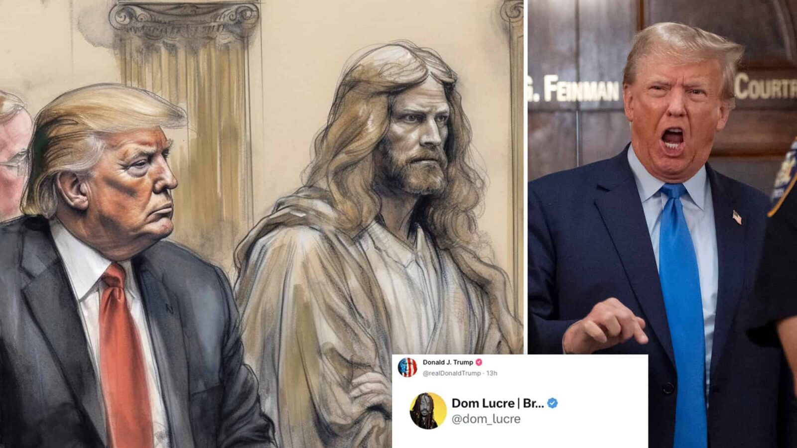 Former President Donald Trump shared a bizarre court sketch of himself sitting next to Jesus before returning to the courtroom for the second day of trial in his Manhattan civil fraud case Tuesday.