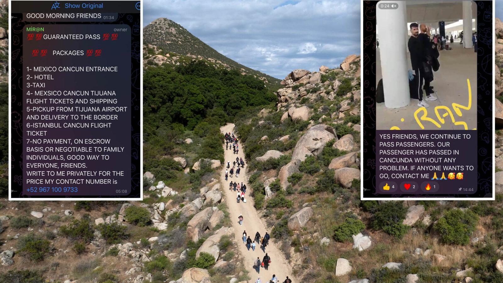 The smugglers’ advertise a route to Tijuana, Mexico, via Cancun, offering secure flights and travel across the border, encouraging migrants to not “delay your dreams.”