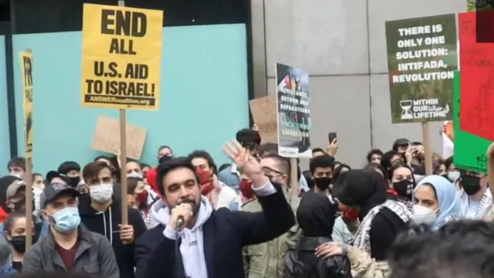 Mamdani urged the crowd to put pressure on elected officials while protestors held up signs saying “End All Aid to Israel!” and “There is Only One Solution Intifada Revolution,” referring to an uprising a Muslim uprising and the destruction of Israel.