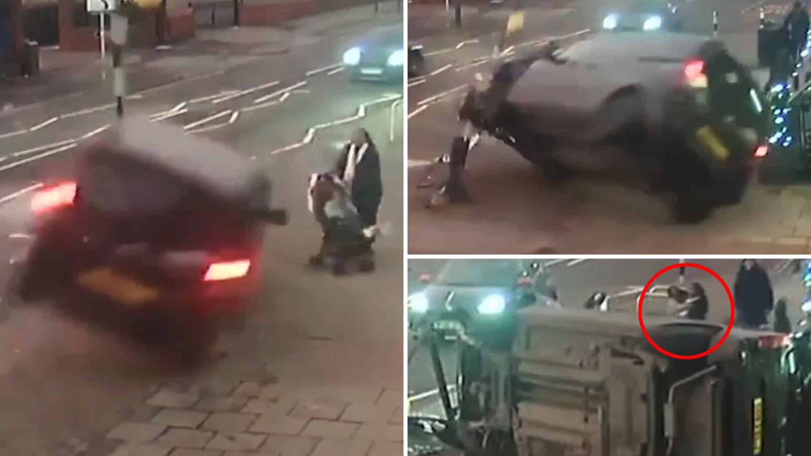 The black SUV slams into a pole for a crosswalk just feet away, sending it spinning onto its right side — right where the mom and her tot were.