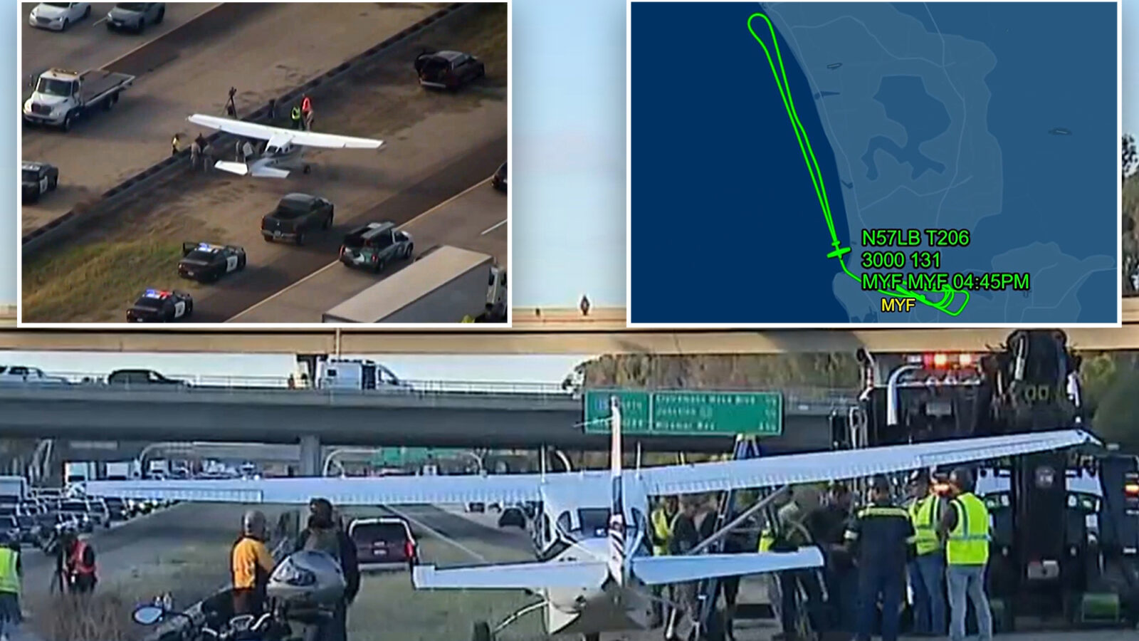 The single-engine Cessna T206  touched down in the center median of the I-15 in San Diego around 4:45 p.m. on Monday after radioing an emergency call over engine failure, according to KGTV.