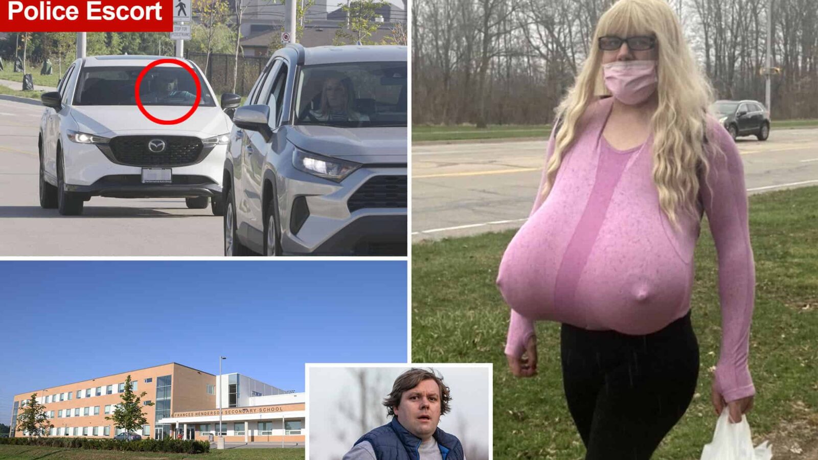 The Canadian teacher who caused outrage by wearing Z-size prosthetic breasts to teach shop class last year was given a police escort to her first day teaching at a new school.